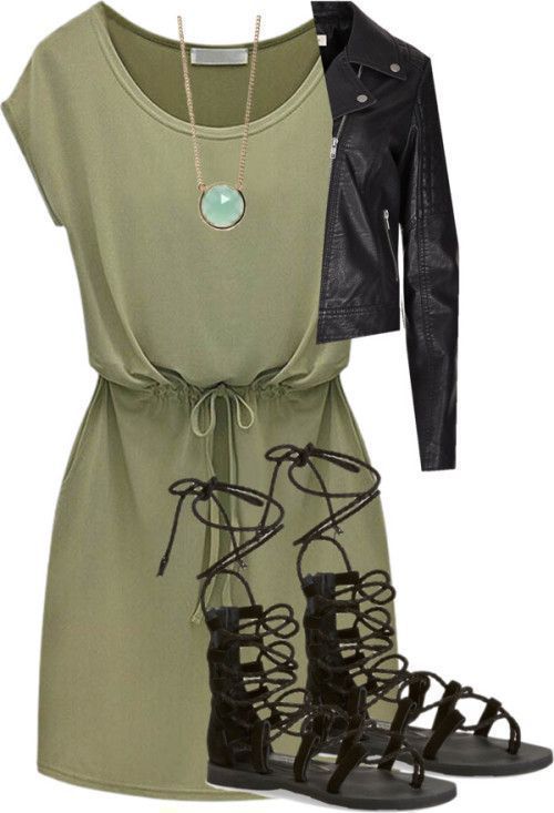 Lizzie was wearing a green dress with a leather jacket and some sandals.