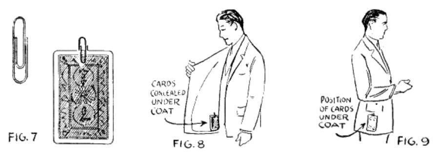 Figure 9 also shows position of cards under coat. They should be far enough from front edge of coat to enable you to reach them easily by curling your fingers up under your coat when your right arm is dropped naturally at your side. Cards face outward. Figure 9.