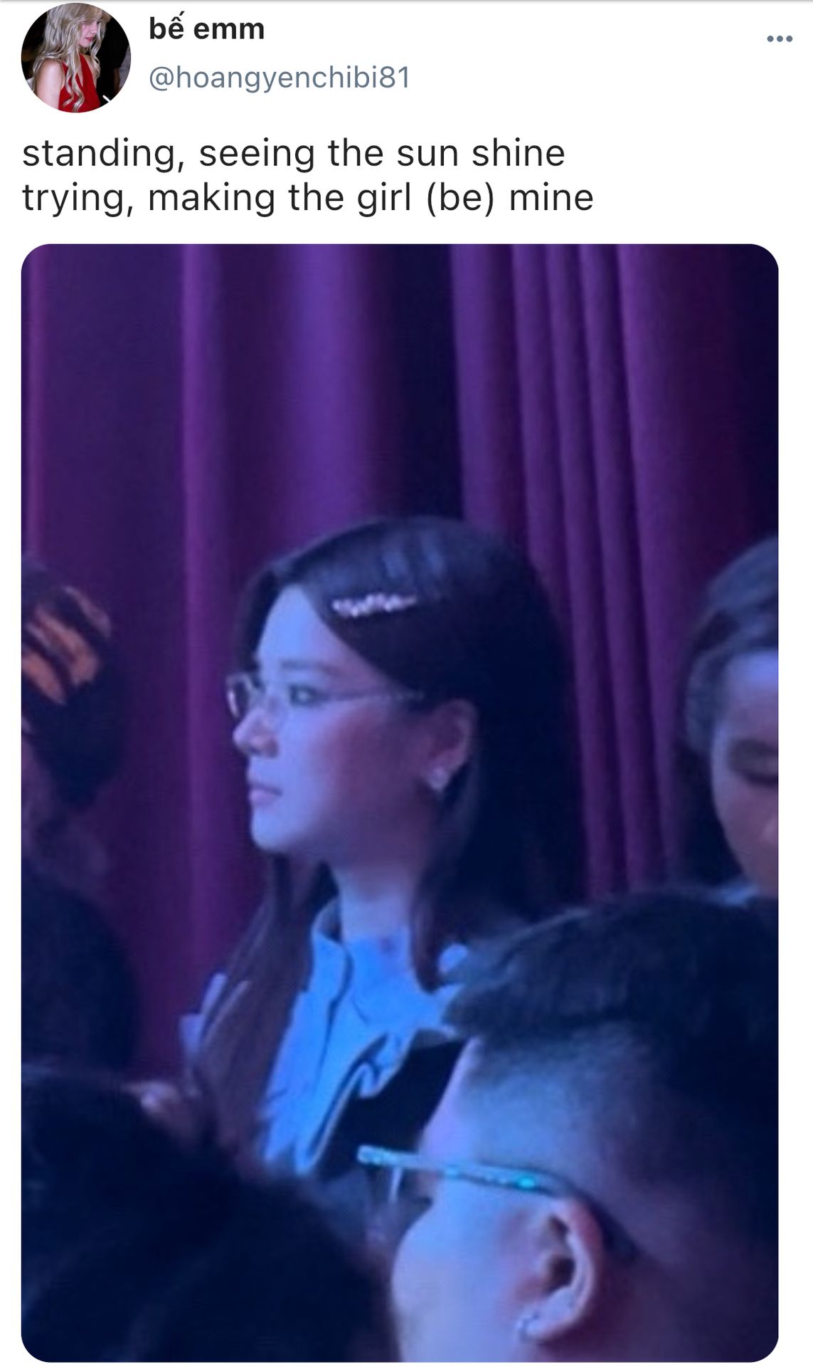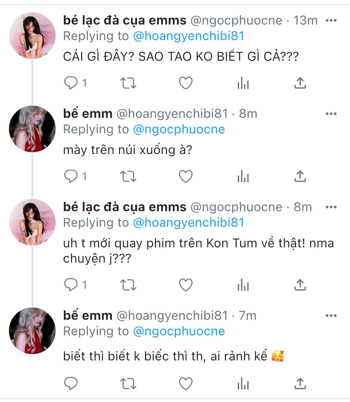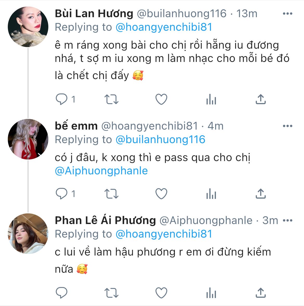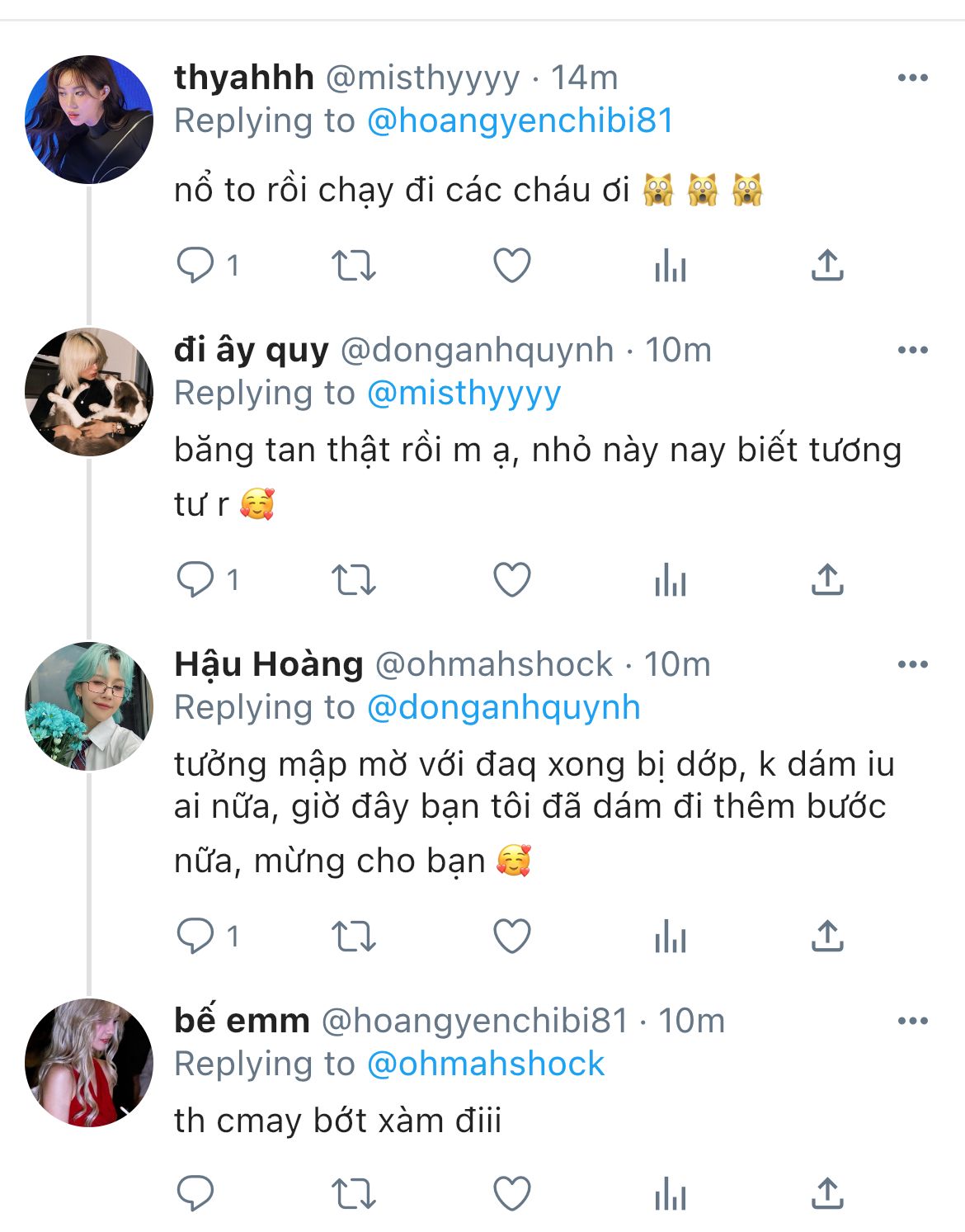 "ê, đăng cái tus gì thế? cậu bị khùng à?"- trương tiểu my hét to vào điện thoại khi em vừa lướt thấy cái post của người kia. hên mà yến chỉ đăng acc private toàn bạn bè của nàng trong showbiz, không là trương tiểu my thành tâm bão dư luận luôn rồi.