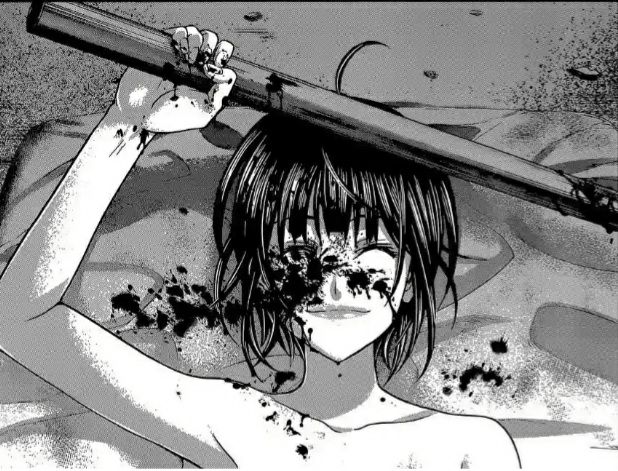 Cô không quan tâm mà nhanh như chớp lao lên, túm lấy tóc kẻ thứ ba. Hắn giãy giụa muốn chạy thoát, củi chỏ liên tục đập vào bụng cô nhưng vô dụng, thậm chí cô còn chẳng động đậy gì. Cố định đầu gã, năm ngón tay Mashiro thọc sâu vào hốc mắt trước khi tên này phản ứng lại, sau đó móc ra nhãn cầu nhầy nhụa một nguyên vẹn một nhơ nhớp nát bét. Mashiro lần nữa thọc hẳn bàn tay vào hốc mắt trống rỗng và nắm chặt, bóp mạnh làm điểm cố định, tay kia dùng lực kéo mạnh tóc, lực mạnh đến nỗi bựt cả da đầu. Máu phun như suối, hắn kêu gào ầm ĩ, cơ thể cứng đờ như co giật đùng đùng.