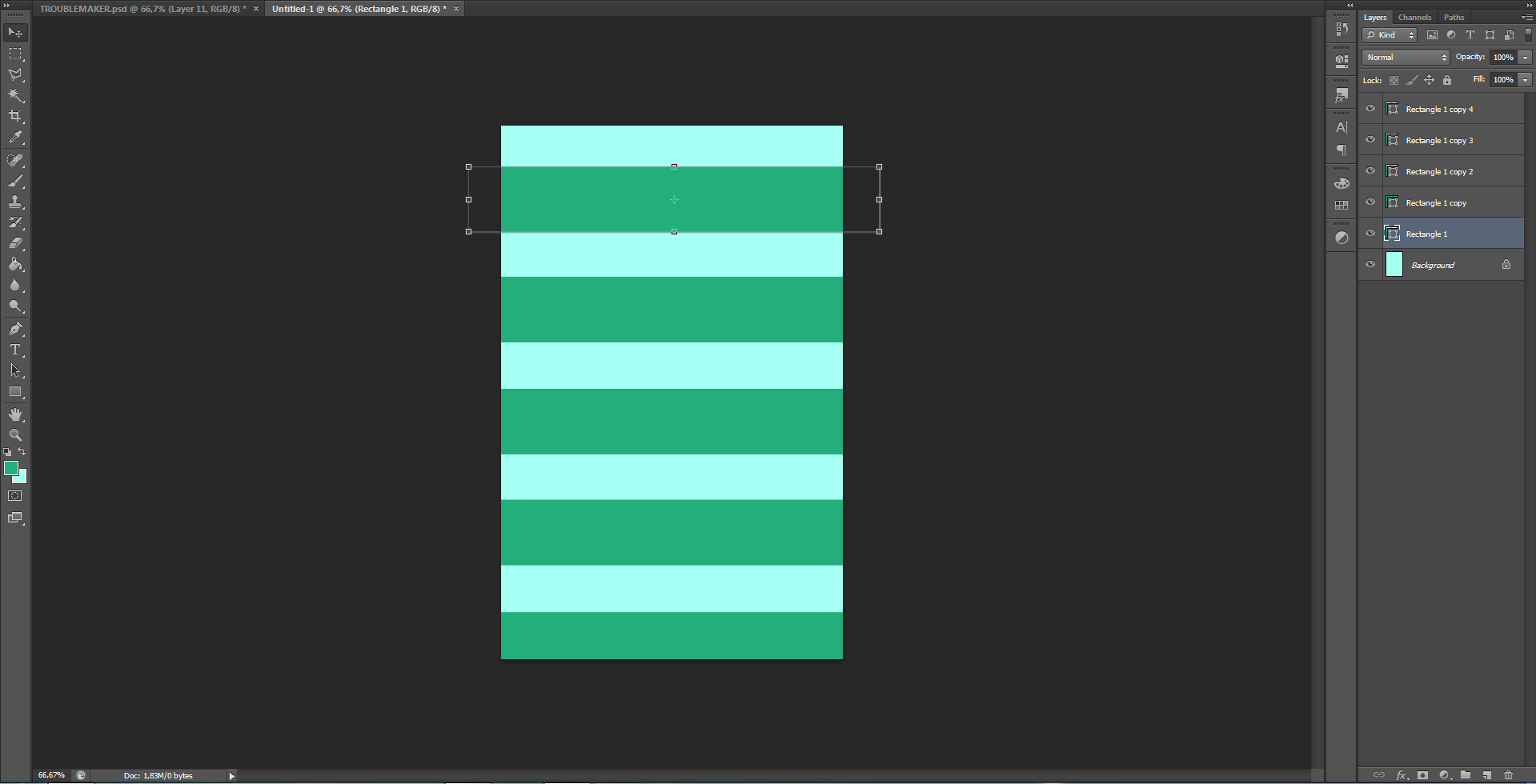 Bước 2: Sử dụng Rectangle Tool để vẽ hình chữ nhật màu xanh đậm. Vẽ 5 hình chữ nhật như vậy (có thể dùng Rectangle Tool liên tiếp hoặc Ctrl + J để nhân đôi hình chữ nhật). Sắp xếp như dưới hình.