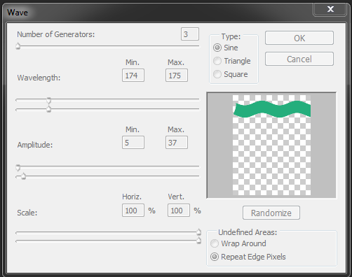 Bước 3: Nhấn vào một hình chữ nhật bất kì. Chọn Filter -> Distort -> Wave. Một cái bảng sẽ hiện ra như hình dưới, chỉnh thông số tùy ý và nhấn Ok khi hoàn thành.