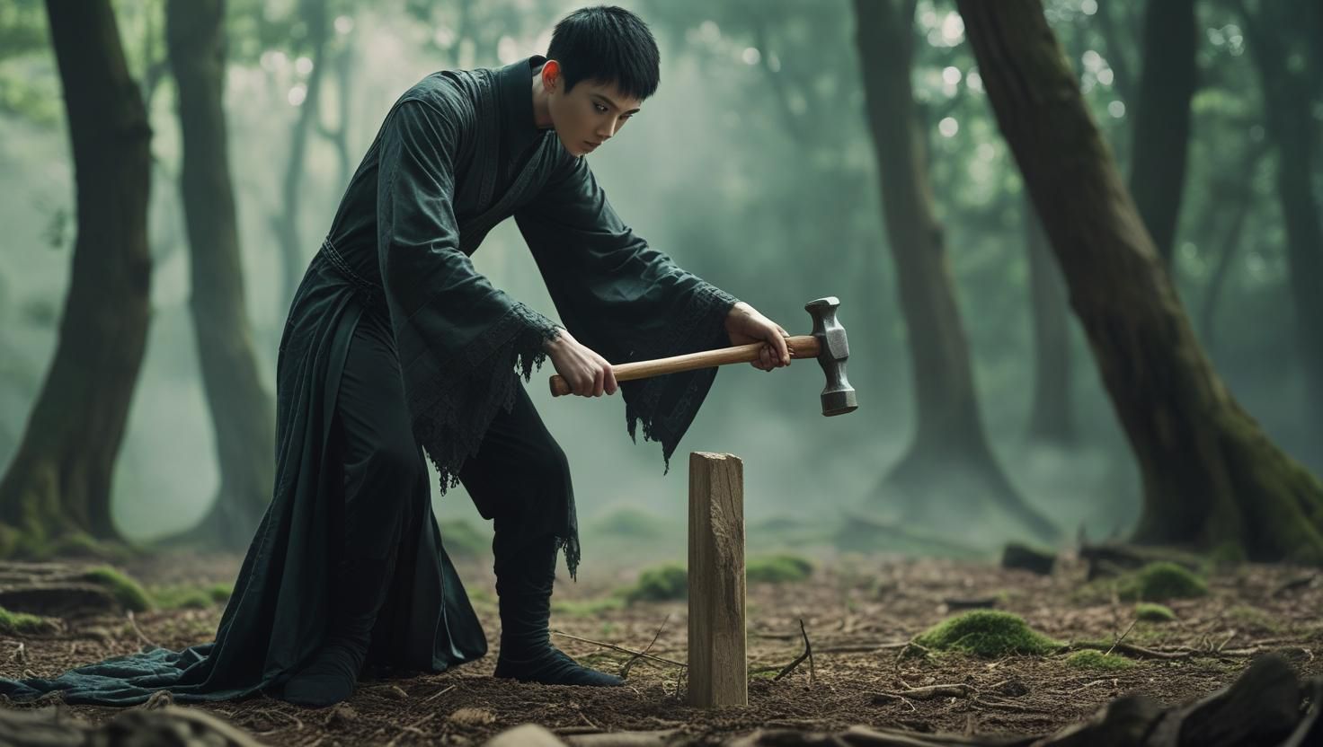 Hắn bay lên ném những đạo phù có gim sẵn những đinh sắt phóng vào cây cọc gỗ khi nãy được cắm sâu ở gần nhà nghỉ rồi bắt ấn niệm phép.
