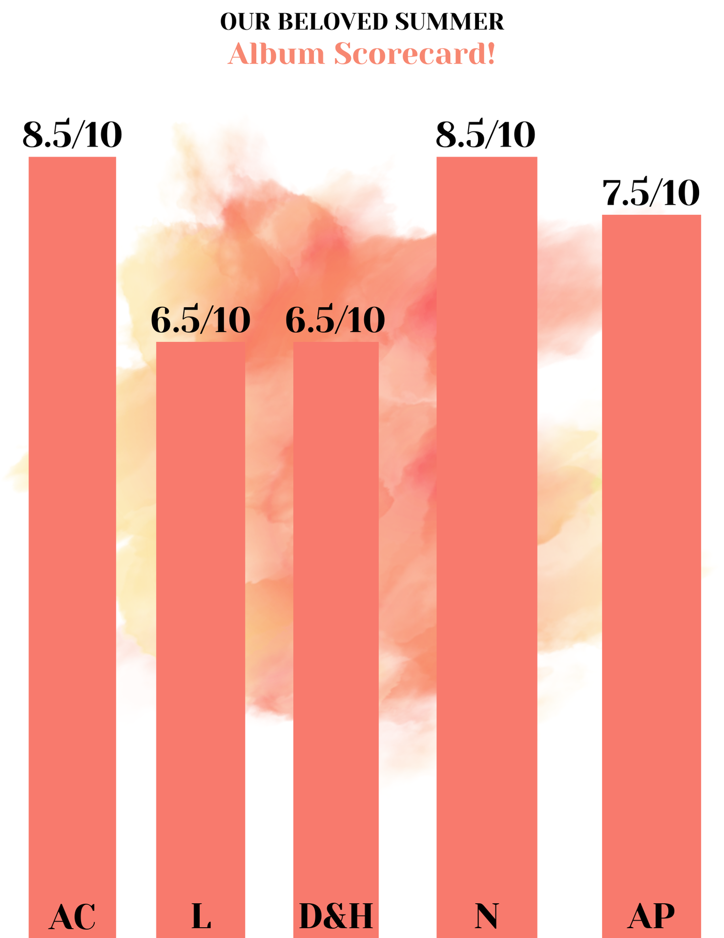 Album Presentation: 7.5/10. Our beloved summer is a good title, but it just needs capitalization or a more clear reason why two of its three words are lowercase, especially when the blurb capitalizes it as Our Beloved Summer. I would recommend either capitalizing it or having the blurb match the title since otherwise it's inconsistent. The cover lowercases it as well, so maybe a simpler fix would be simply lowercasing it in the blurb for more consistency. Otherwise, the title is good.