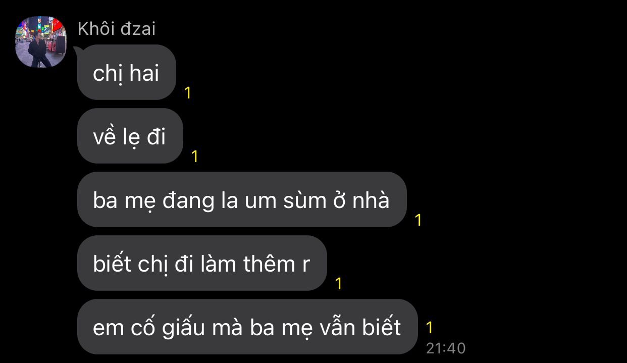 " chị vẫn đi làm thêm à? " Khôi đứng cạnh bàn học trong phòng chị gái, còn cô thì đang ngồi trong bàn học chăm chú viết gì đó.
