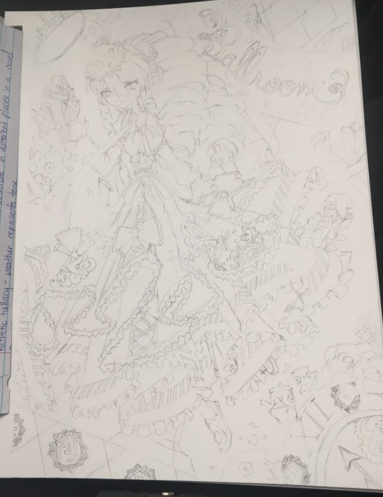 (Had to do this sketch in intervals so I didn't rush the frills, mylord there's more dress folds and frills on her dress than sand on earth)