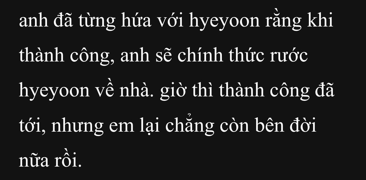 wooseok biết đây là một yêu cầu có hơi quá phận. vị trí hiện tại của wooseok trong lòng hyeyoon chẳng phải bạn trai, cũng chẳng phải bạn bè thân thiết, chỉ đơn giản là một kẻ thầm thương em đang cố loay hoay khẳng định sự tồn tại của mình. anh không có lý do ép buộc hyeyoon phải chia sẻ tất cả mọi chuyện với mình, nhưng bản thân vẫn là không nhịn được mà đành mạnh dạn ngỏ lời.