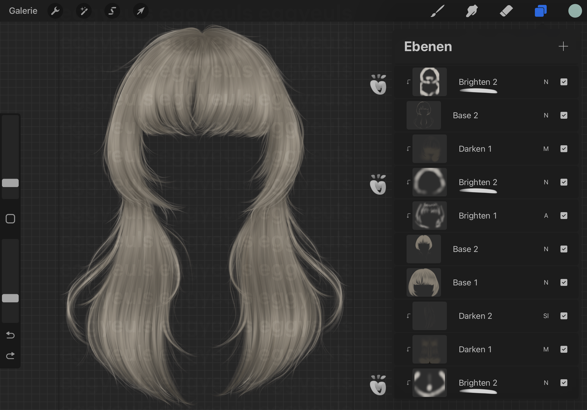I know I did not really explain the colors I used or what way I mixed the layers (e.g. setting them to multiply/overlay or whatsoever). The reason is that even those steps can vary a lot and work out differently for different programs/apps, even if they are named the same way. But I can show you the colors I used for this hair stock in specific and the ways I mixed the canvas' layers. Just keep in mind: it works differently for every program/app and also for every hair color. What works for blonde hair may need be done differently for bright blue or dark/black hair.